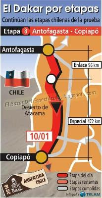 Desde las 6 de la mañana de hoy, las motos comenzaron a salir del Vivac de esta ciudad chilena de Antofagasta, para iniciar la 8va etapa a lo largo de 568 kilómetros de un desierto de dunas, que terminará en Copiapó, en lo que se constituye como la 2ª mitad del "Dakar Argentina-Chile 2010".